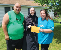 On Saturday, June 8 the annual Helping Hands Day was held at Holy Annunciation Monastery in Sugarloaf. We had fantastic weather and a nice turnout of volunteers to help with both indoor and outdoor activities. There was something to do for all ages and skill levels. The outdoor volunteers did gardening, clearing of rocks & brush, lawnmowing and weed eating. Volunteers that stayed indoors helped create boxes and prepped bakery supplies. GCU Board Member George Kofel and GCU Corporate Community Events Coordinator Melissa Jaggars presented a $500.00 check to Mother Maria for the Holy Annunciation Monastery.