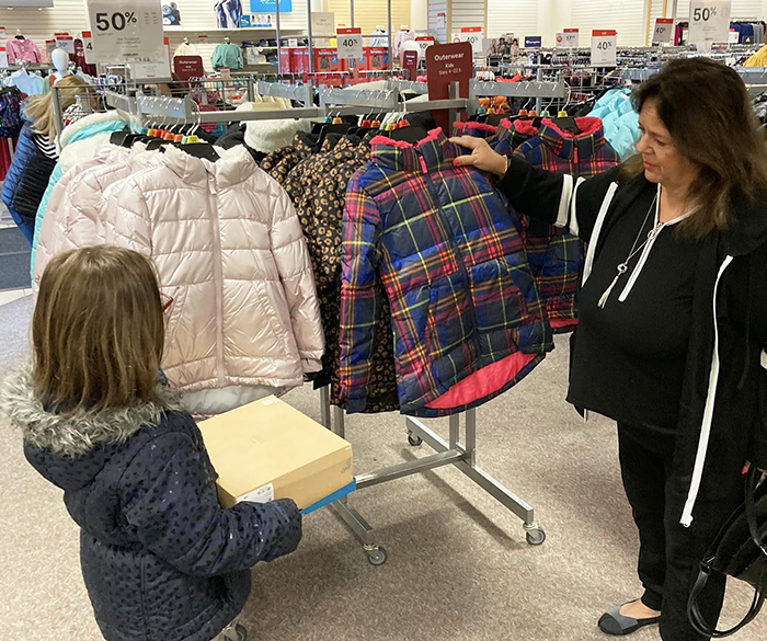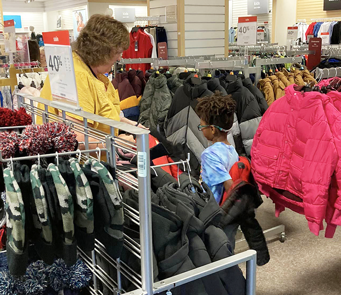 Sue Juba looking at coats.