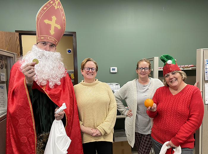 Salvation Army Treasures for Children. The GCU Home Office and Seven Oaks staff purchased Christmas gifts for the children for the Salvation Army Treasures for Children program. Once again the staff was abundant in their holiday giving. Thanks to all who participated in making kids happy this Christmas. Shown with the gifts are St. Nicholas (our very own Social Media Strategist Mitch Valvano) and his elf helper Member/Agent Service Representative Gina Spickerman. They both spread cheer throughout the Home Office on December 6 to celebrate St. Nicholas Day.