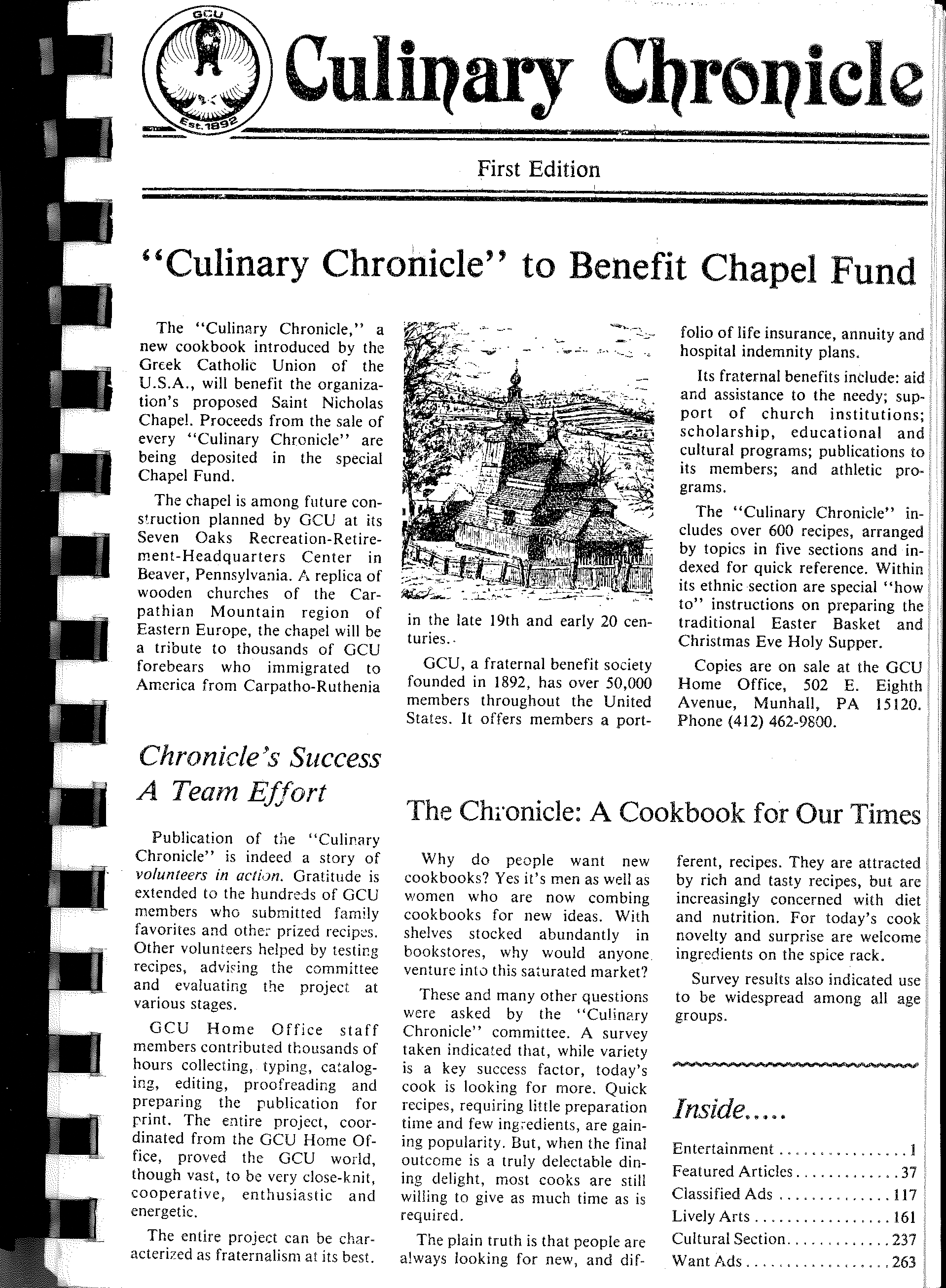The GCU Culinary Chronicle Cookbook was first published in 1985 as a fund raising tool for the proposed construction of a wooden church on the GCU property in Beaver, PA. The dream was realized with the completion of the GCU St. Nicholas Chapel in 1992. The cookbook, over 270 pages of favorite family and ethnic recipes, has continued to be very popular. The proceeds from sales now benefit the GCU Foundation with $1 from each book sold going directly to the GCU Cause of the Quarter. The cookbook is available in its original printed version for a cost of $20 ($10 plus $10 for shipping) or in a downloadable version (PDF) for the cost of $8.